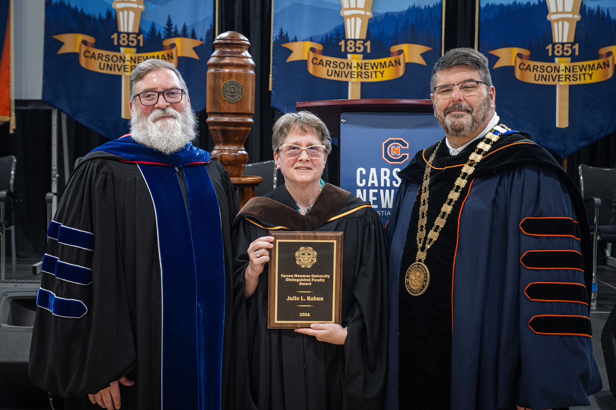 category: Campus News C-N recognizes faculty, staff with highest honors category: Campus News | April 14, 2026 Julie Rabun receives congratulations from C-N Provost Jeremy J. Buckner, left, and University President Charles A. Fowler, right. Rabun was awarded the University's 2026 Distinguished Faculty Award. Also recognized were Jasmine Lindsey and Ande Munsey as C-N's SOAR Award recipients. The three were recognized during the University's Honors Convocation. Carson-Newman University presented some of its highest awards to faculty and staff during its 57th annual Honors Convocation on April 14. Those honored were Jasmine Lindsey, Ande Munsey, and Julie Rabun. The University presented Rabun with the 2026 Distinguished Faculty Award. The honor is the University’s highest recognition of a tenured faculty member who is active within the community and recognized by their peers, students and alumni as an outstanding teacher and mentor. Rabun joined Carson-Newman’s art faculty in fall of 2002 and began serving as chair of the Art Department in 2014. Throughout her tenure, she has been credited for being an inspiring teacher in the classroom and a tireless mentor for her students. She used her talents to help with C-N’s Quality Enhancement Plan (QEP) on service-learning, creating a service-learning course in the graphic design program, which paired art students with non-profit organizations in need of professional design work. This and other efforts led her to be honored with a Twin Pillars Award for Service-Learning. Over the years, she has directed or served as a reader on multiple honors projects and has helped design C-N’s annual student and faculty literary journal, “Ampersand.” Rabun has not only served as an ambassador for the Art Department, she has also sought to improve and enhance it. She established a Mac computer lab in the Warren Art Building and has helped maintain it. She oversaw a committee that launched a major outreach and fundraising effort that replaced all the windows in Warren. She also helped secure funding to maintain and upgrade the building’s two art galleries, the Michael Alvis Gallery and the Julie Rabun Student Gallery. An artist and freelance graphic designer and illustrator, Rabun’s work has been featured in several publications, and her work has been showcased in numerous exhibits. Rabun received her undergraduate degree from Rhode Island School of Design before earning her Master of Fine Arts degree from Virginia Commonwealth University. Jasmine Lindsey and Ande Munsey are this year’s recipients of the SOAR Award, the highest honor given to staff members. Recipients must have served C-N for at least five years and exhibit passion for furthering the University’s mission, excellence in their job performance, and positivity in their spirit and attitude. As data management coordinator for C-N’s School of Education and Counseling, Lindsey is central to assisting faculty, supporting students, and collaborating with colleagues. Whether through assisting with administrative details for the William Blevins Institute for Spirituality and Mental Health or helping coordinate the Mossy Creek Literary Conference, she is often praised by her colleagues for her professionalism, grace, and integrity. She is credited with being creative, thoughtful and forward thinking, and dedicated to upholding the University’s Christ-centered mission. Munsey serves as coordinator of institution research and development. A native of Morristown and resident of Talbott, Munsey has a reputation as a welcoming soul on campus. Of his some 30 years in higher education information technology, 12 have been at Mossy Creek. While at Carson-Newman he has shown a tireless dedication to his work while exhibiting a true dedication to the University’s mission. His colleagues describe his Christ-like humility and voice of encouragement. Munsey’s compassion for those around him is evident, as he often takes time in his busy day to help and to listen to others. Julie Rabun receives congratulations from C-N Provost Jeremy J. Buckner, left, and University President Charles A. Fowler, right. Rabun was awarded the University's 2026 Distinguished Faculty Award. Also recognized were Jasmine Lindsey and Ande Munsey as C-N's SOAR Award recipients. The three were recognized during the University's Honors Convocation.