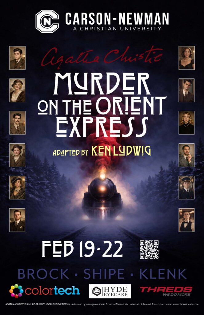 category: Campus News C-N theater presents “Murder on the Orient Express” category: Campus News | February 6, 2026 Carson-Newman University’s Theatre Program presents a production of thrills and mystery via “Murder on the Orient Express,” February 19-22. Tickets are on sale now. Directed by Kyle Biery, Carson-Newman’s Charles Fuller Chair of Drama, the production is adapted by Ken Ludwig from the classic novel by Agatha Christie. Set in the cold of winter, the story features the luxurious Orient Express as welcomes an unlikely gathering of passengers— each perhaps carrying secrets with their suitcases. When the train is stranded in a snowdrift, tensions rise… a murder is discovered! That’s when attention turns to world-famous detective Hercule Poirot, played by C-N student Davis Bigelow. With deception and suspense in every train car, “Murder on the Orient Express” is often referred to as the ultimate “whodunit.”Joining Bigelow in the ensemble-driven production are John Sofield (Monsieur Bouc), Emmaline Estep (Mrs. Hubbard), Molly Cox (Countess Andrenyi), Josiah Crook (Colonel Arbuthnot), Lexi Garren (Mary Debenham), Ella Smith (Princess Dragomiroff), Treis Garrett (Hector MacQueen), Dominic DeMaro (Michel, the Conductor), Anna Heflin (Greta Ohlsson), Seth Stokes (Samuel Ratchett), and Ariana Reller (Head Waiter).Sponsored by Brock, Shipe and Klenk, Colortech, Hyde Eyecare and Threds, the event will be held in Gentry Auditorium located in the University’s Henderson Humanities Building. Seating is limited.Content Advisory: This production is rated PG-13 for language and violent themes. Performance times:Feb. 19-21 at 7:30 p.m.Feb. 22 at 2 p.m. For tickets and information, visit: www.cn.edu/programs/theatre