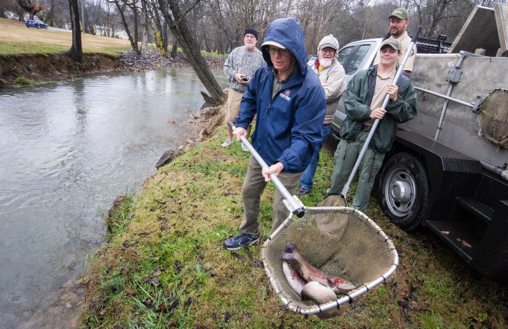 category: Campus News Campus onlookers brave weather, find something fishy at Mossy Creek category: Campus News | November 21, 2025 Sally Petre of the Tennessee Wildlife Resources Agency holds a Rainbow Trout on the banks of Mossy Creek. The fish was one of 300 trout added to Mossy Creek during TWRA’s winter trout stocking program in November. An additional 600 fish will be added in December and January. Those who frequent historic Mossy Creek on Carson-Newman’s campus are commonly treated to glimpses of active wildlife along the creek’s grassy banks and cool, winding waters. Herons, otters, beavers, frogs and crawfish are often sighted by onlookers and showcased on Facebook pages and Instagram Reels.On Friday, Nov. 21, Mossy Creek became home to more wildlife as a hover of 300 Rainbow Trout was sent into the campus waters. Members of the Carson-Newman and greater Jefferson City community weathered a rainy morning to gather and take part in the event. The effort was overseen by the Tennessee Wildlife Resources Agency (TWRA) as part of its winter trout stocking program. Not since the 1980s has TWRA stocked Rainbow Trout into Mossy Creek, a Cherokee River tributary. According to TWRA the trout was raised at Buffalo Springs Hatchery located in nearby Rutledge, Tennessee. The agency plans to release an additional 600 trout in Mossy Creek through January. Carson-Newman’s Donnie Newman transports Rainbow Trout to Mossy Creek. Members of the community were invited to take part in the TWRA’s winter trout stocking program at Mossy Creek on the University’s campus. The stocking is a welcomed event for the University’s Biology Department. “The Carson-Newman Wildlife Biology program is excited about the efforts to stock Rainbow Trout into Mossy Creek,” said Dr. Jessica Evans, C-N assistant professor of biology. “This initiative provides a wonderful on-campus opportunity for our students to observe and engage in conservation practices firsthand. Efforts like these play a vital role in preparing our students for future careers in wildlife biology by deepening their understanding of real-world conservation work.”The project is a culmination of efforts involving TWRA, Carson-Newman University, The Jefferson County Tourism Department, Mossy Creek Outdoor Collective, and the City of Jefferson City.For Carson-Newman, Mossy Creek offers as a direct tie to its historic past. The land around the creek served as the location of the original campus of the institution, which was founded in 1851. The area was later the site of The Battle of Mossy Creek during the American Civil War. With the creek serving as a catalyst of many stories, folklore and anecdotes, the fall arrival of 300 Rainbow Trout only adds to the tales and events that have made Mossy Creek a special place for both campus and community. Sally Petre of the Tennessee Wildlife Resources Agency holds a Rainbow Trout on the banks of Mossy Creek. The fish was one of 300 trout added to Mossy Creek during TWRA’s winter trout stocking program in November. An additional 600 fish will be added in December and January.