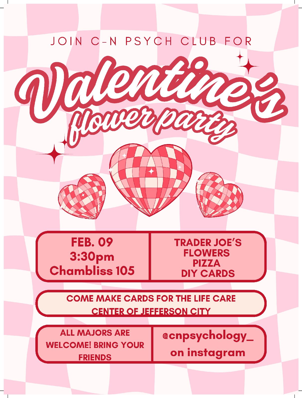 A flower bar creates an inclusive, welcoming activity that celebrates friendship and belonging. Students can give flowers to friends, roommates, professors, or staff as a simple way to show appreciation and compassion. We are spreading love and joy through notecards to gift to local Nursing homes.