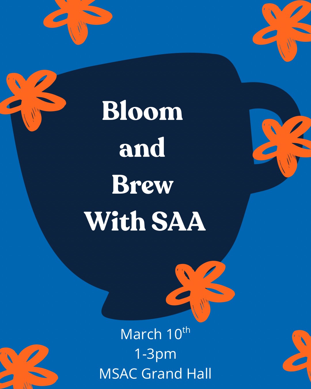 Bloom & Brew March 10 @ 1:00 PM - 3:00 PM MSAC Grand Hall SAA is hosting this event to help connect with students while being able to create their own flower bouquet and enjoy a cup of coffee!