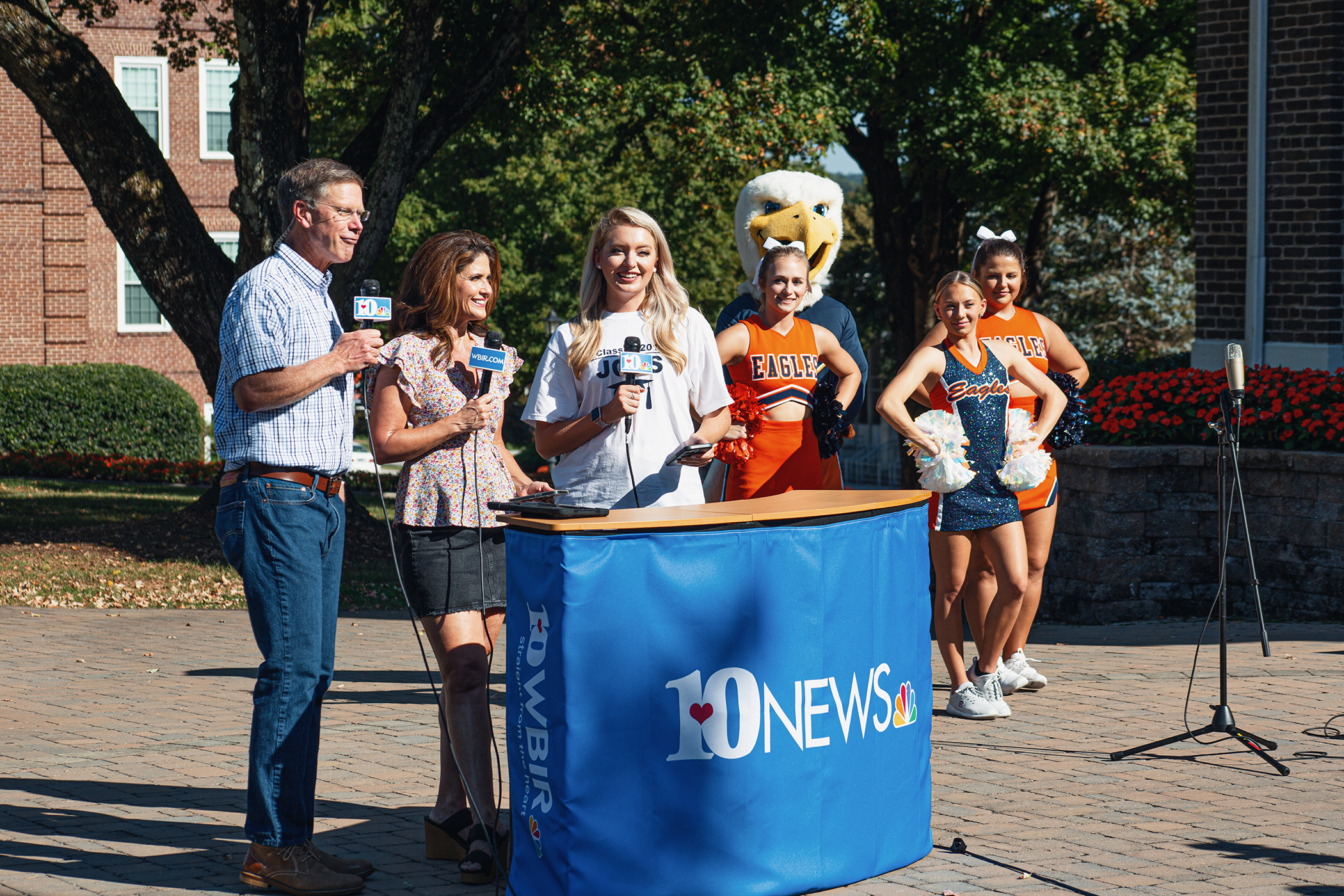 category: Campus News Knoxville’s WBIR-10 visits campus category: Campus News | September 26, 2022 Members of WBIR-10 broadcast from campus. Pictured left to right are WBIR’s Todd Howell, Beth Haynes, Jefferson County native Katie Inman, along with “Talon” and members of C-N’s dance and cheer teams. WBIR-10, Knoxville’s NBC affiliate, broadcast their Live at Five at Four program from Carson-Newman University’s campus on Wednesday, Sept. 21. The program highlighted the University as well as Jefferson County as part of its Hometown Spotlight. Members of WBIR-10 broadcast from campus. Pictured left to right are WBIR’s Todd Howell, Beth Haynes, Jefferson County native Katie Inman, along with “Talon” and members of C-N’s dance and cheer teams.